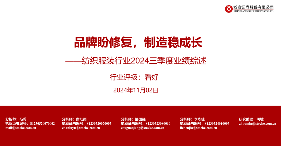 【浙商证券】【20241102】纺织服装行业2024三季度业绩综述:品牌盼修复,制造稳成长-17页
