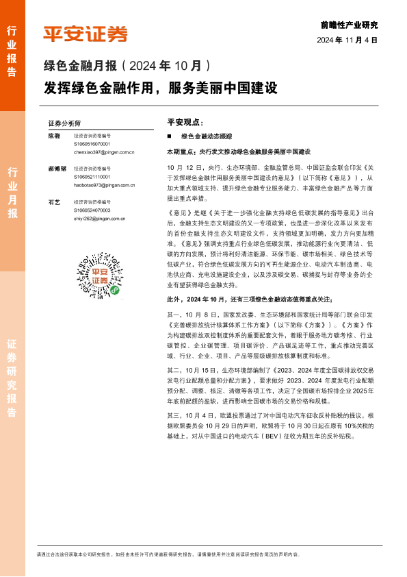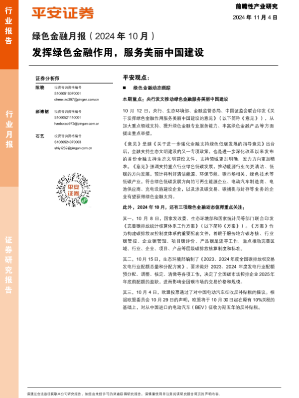 【平安证券】【20241104】绿色金融行业月报(2024年10月):发挥绿色金融作用,服务美丽中国建设-13页