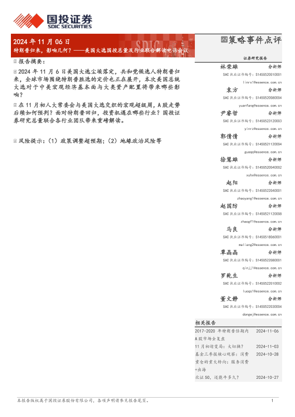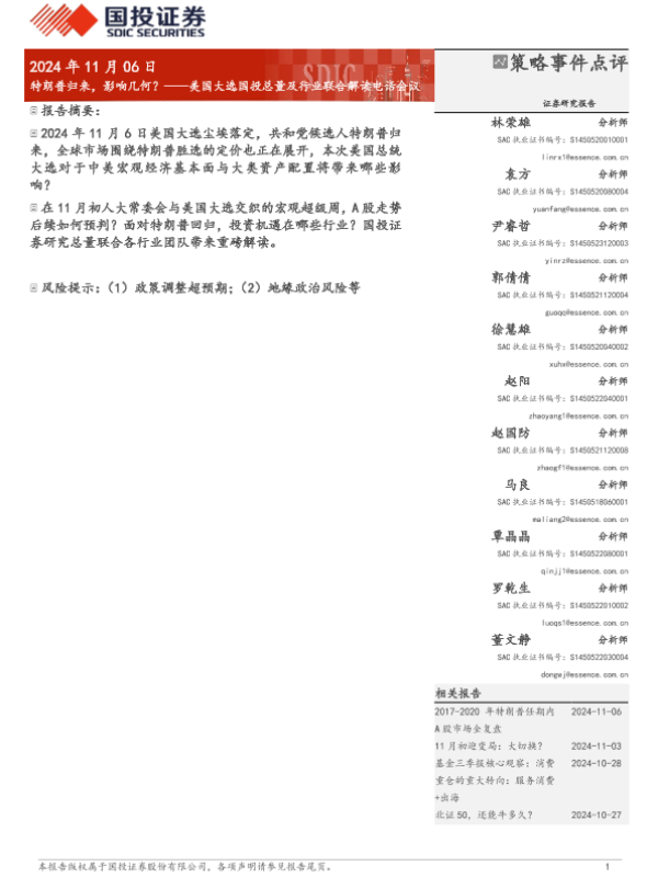 【国投证券】【20241106】美国大选国投总量及行业联合解读电话会议:特朗普归来,影响几何?-11页