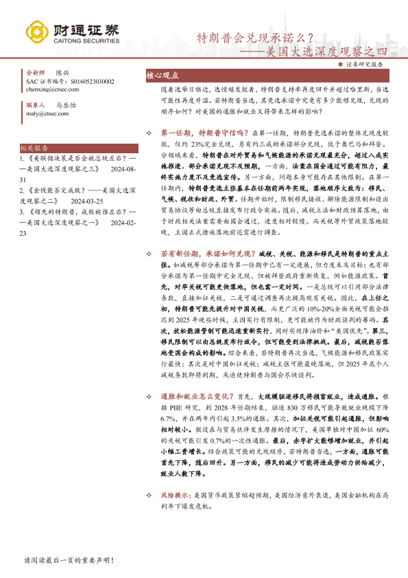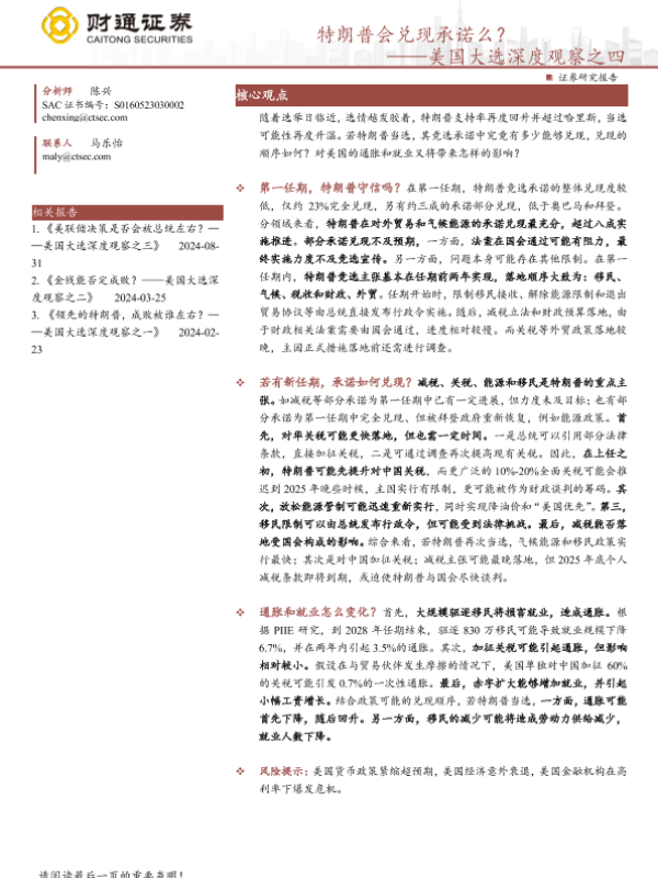 【财通证券】【202410】美国大选深度观察之四:特朗普会兑现承诺么?-13页