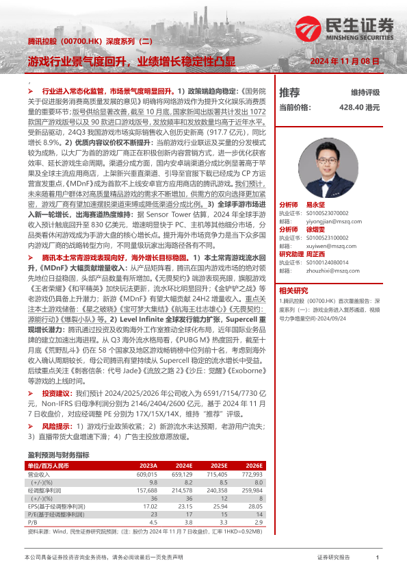 【民生证券】【20241108】腾讯控股(00700.HK)深度系列(二):游戏行业景气度回升,业绩增长稳定性凸显-36页