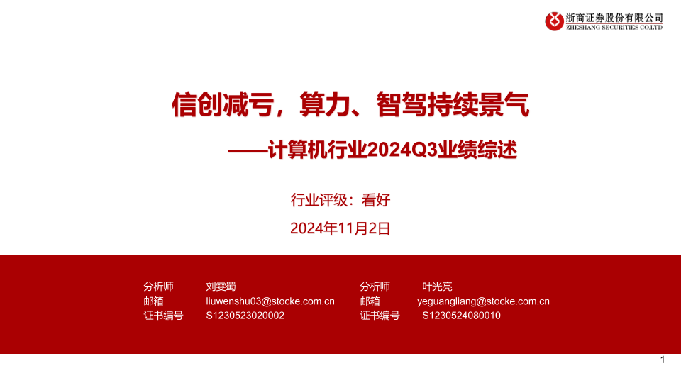 【浙商证券】【20241102】计算机行业2024Q3业绩综述:信创减亏,算力、智驾持续景气-19页