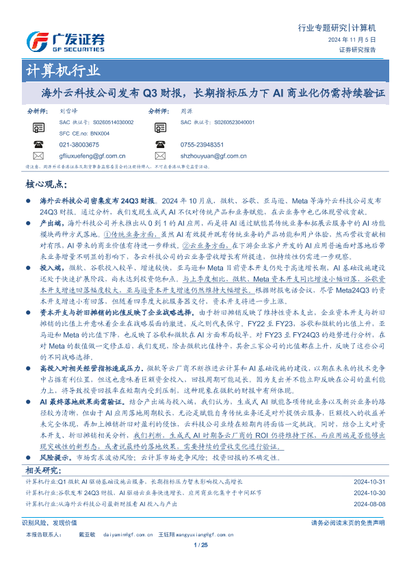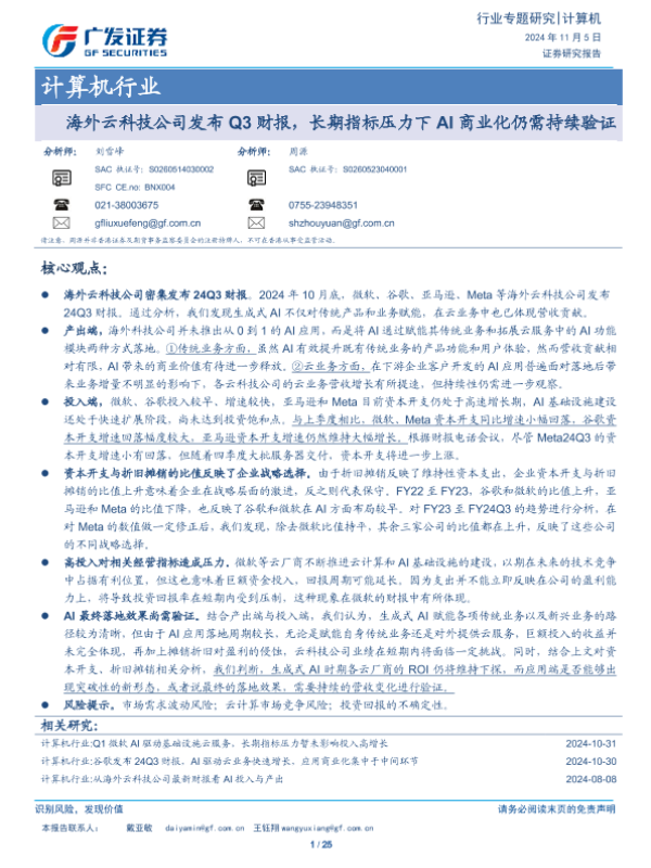 【广发证券】【20241105】海外云科技公司发布Q3财报,长期指标压力下AI商业化仍需持续验证-25页