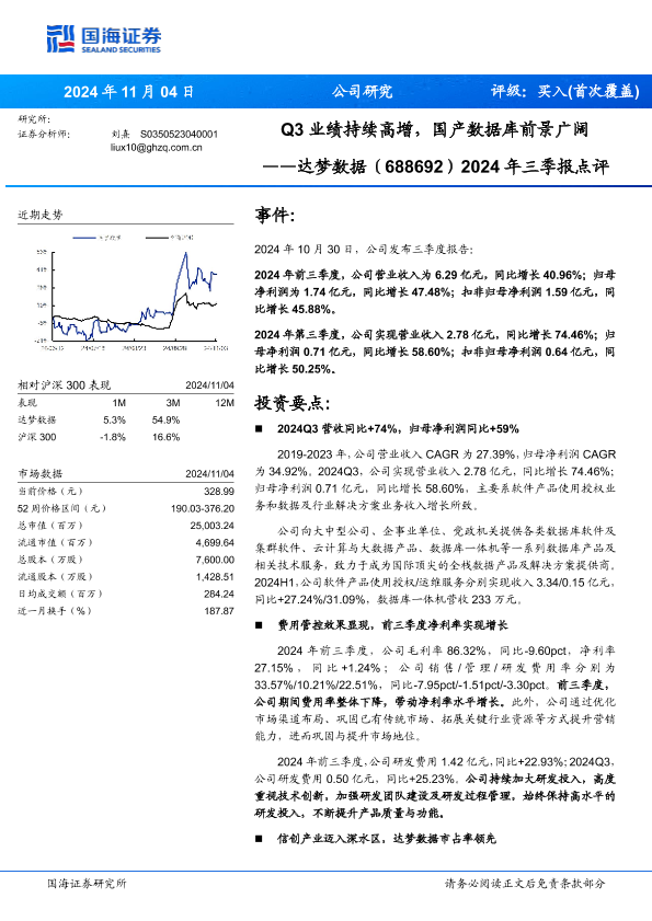 【国海证券】【20241104】达梦数据(688692)2024年三季报点评:Q3业绩持续高增,国产数据库前景广阔-12页