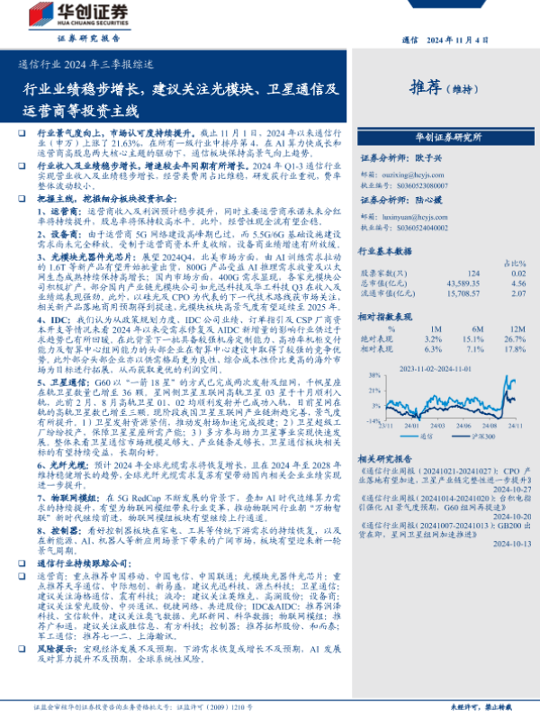 【华创证券】【20241104】通信行业2024年三季报综述:行业业绩稳步增长,建议关注光模块、卫星通信及运营商等投资主线-24页