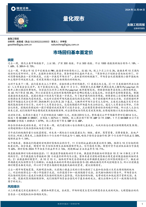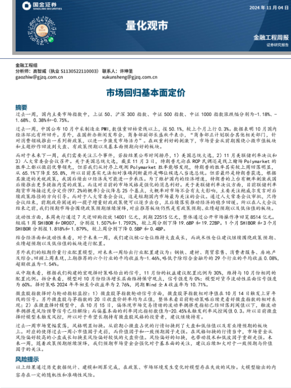 【国金证券】【20241104】量化观市:市场回归基本面定价-13页