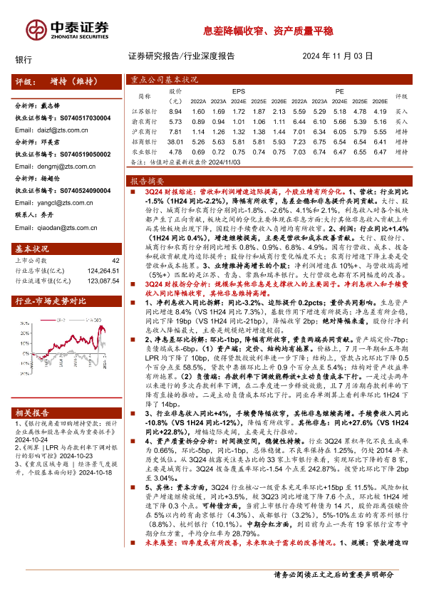 【中泰证券】【20241103】银行业深度综述与拆分|42家上市银行三季报:增速边际小幅提高、息差降幅收窄、资产质量平稳-39页