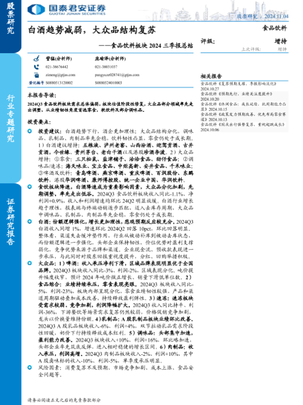 【国泰君安证券】【20241104】食品饮料板块2024三季报总结:白酒趋势减弱,大众品结构复苏-46页