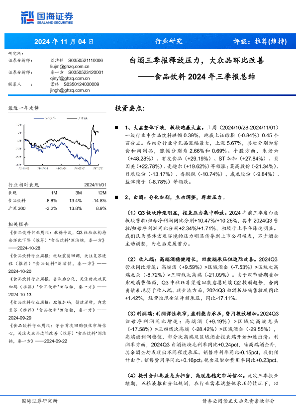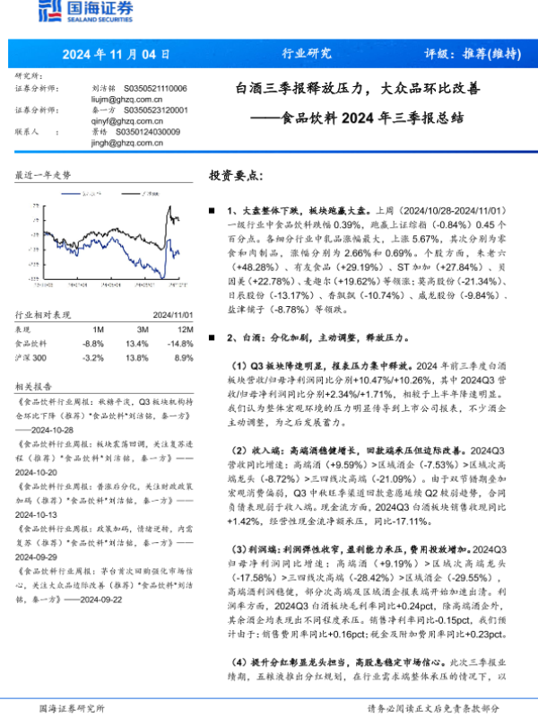 【国海证券】【20241104】食品饮料行业2024年三季报总结:白酒三季报释放压力,大众品环比改善-19页