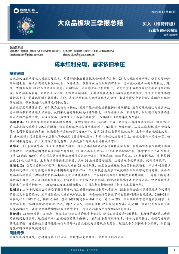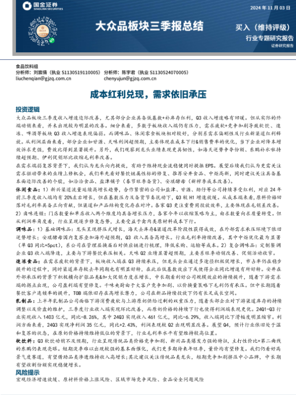 【国金证券】【20241103】食品饮料行业大众品板块三季报总结:成本红利兑现,需求依旧承压-22页