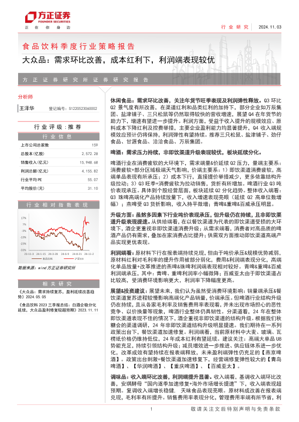 【方正证券】【20241103】食品饮料行业季度行业策略报告-大众品:需求环比改善,成本红利下,利润端表现较优-30页