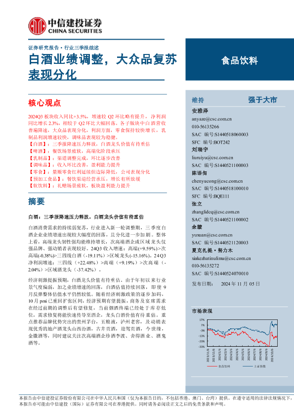 【中信建投证券】【20241105】食品饮料行业:白酒业绩调整,大众品复苏表现分化-66页