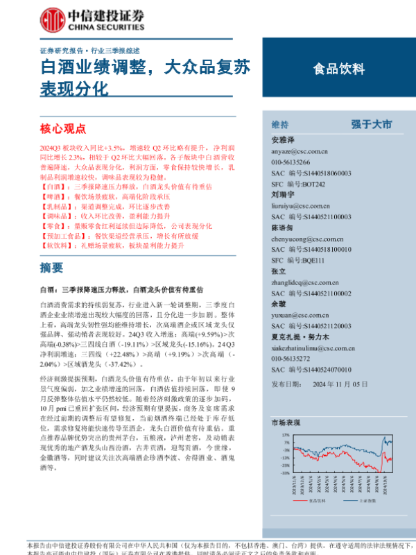 三季报 大众品复苏 白酒业绩 行业分析 食品饮料