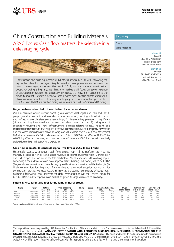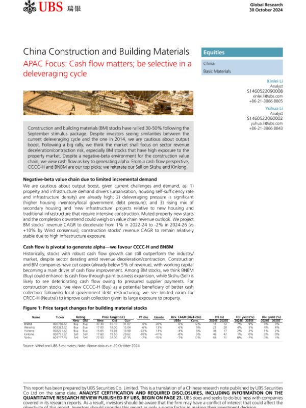 【UBS Securities Co. Limited】【20241030】ies-APAC Focus China Construction and Building Materials_Cash flow matters; be selective in a deleveraging cycle-31页