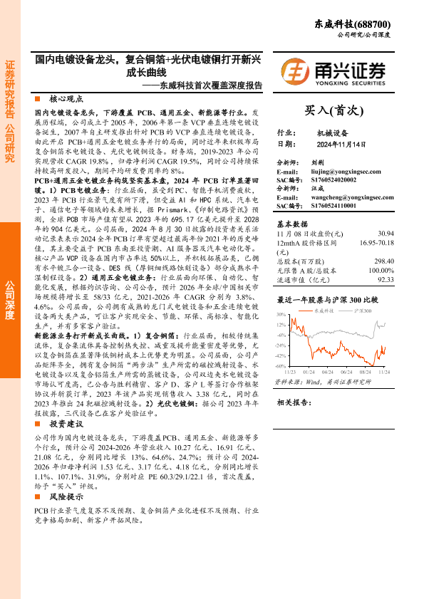 【甬兴证券】【20241114】东威科技(688700)首次覆盖深度报告:国内电镀设备龙头,复合铜箔+光伏电镀铜打开新兴成长曲线-22页
