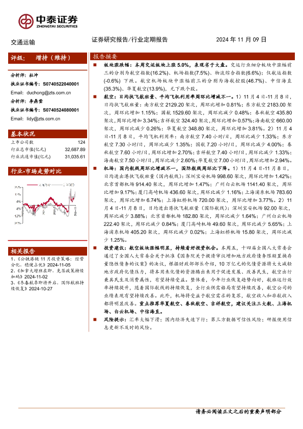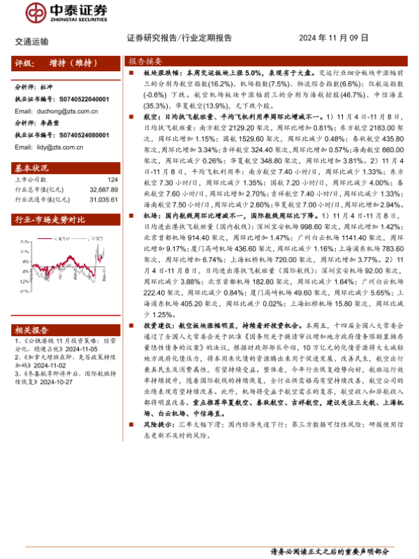 【中泰证券】【20241109】交通运输行业:航空板块涨幅明显,持续看好投资机会-23页