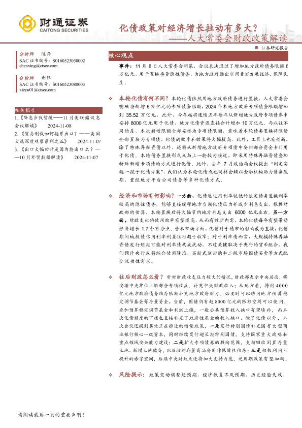 【财通证券】【20241109】人大常委会财政政策解读:化债政策对经济增长拉动有多大?-10页
