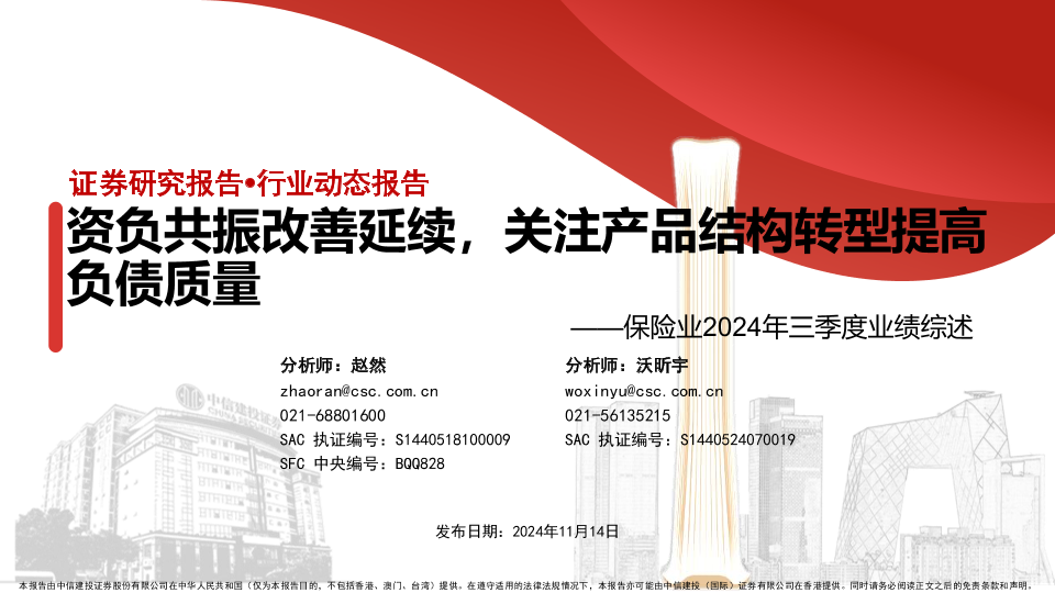 【中信建投证券】【20241114】保险行业2024年三季度业绩综述:资负共振改善延续,关注产品结构转型提高负债质量-29页