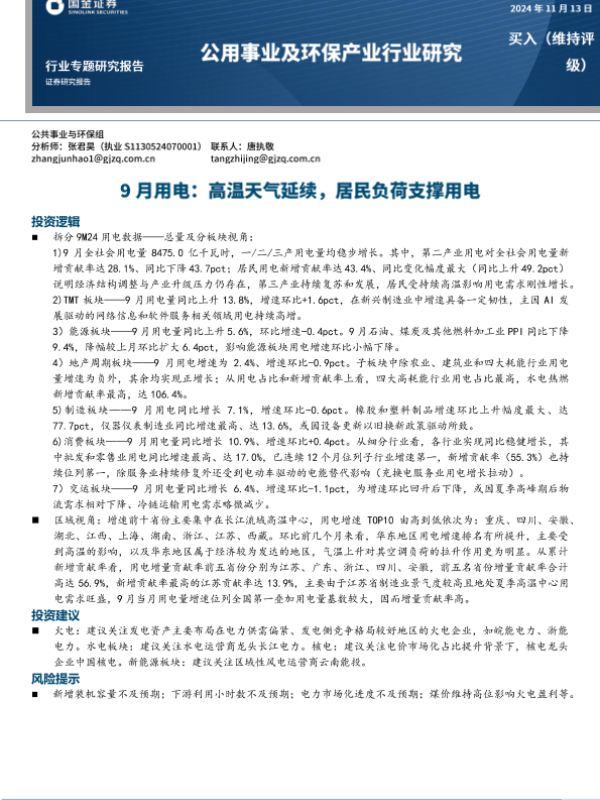 【国金证券】【20241113】公用事业及环保产业行业:9月用电,高温天t延续,居民负荷支撑用电-16页