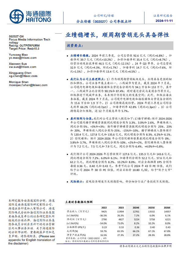 【海通国际】【20241111】分众传媒(002027)公司季报点评:业绩稳增长,顺周期营销龙头具备弹性-12页