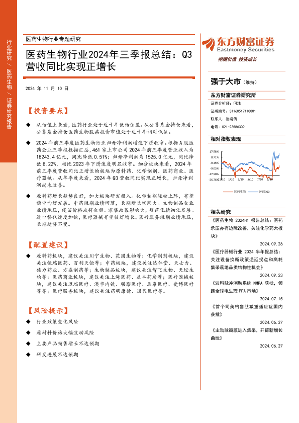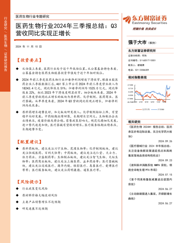 【东方财富证券】【20241110】医药生物行业2024年三季报总结:Q3营收同比实现正增长-20页