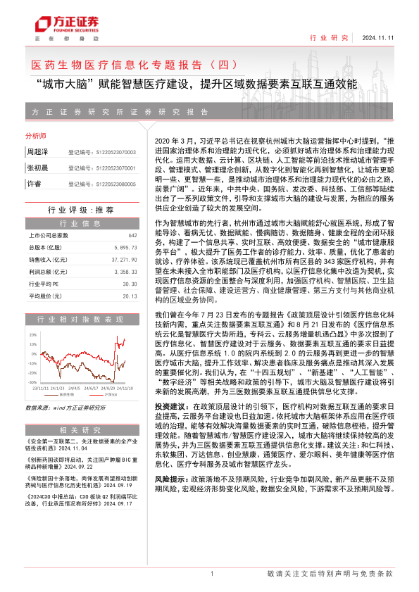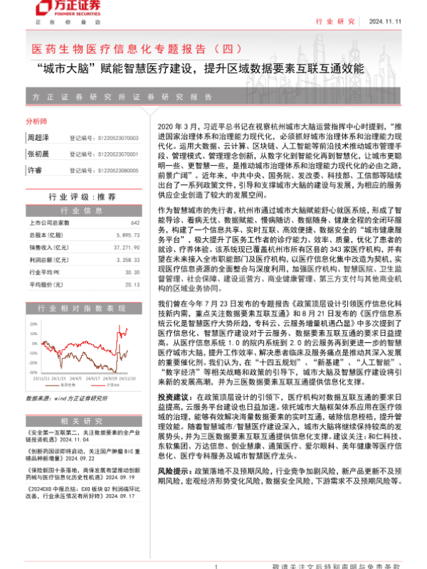 【方正证券】【20241111】医药生物行业医疗信息化专题报告(四):“城市大脑”赋能智慧医疗建设,提升区域数据要素互联互通效能-14页