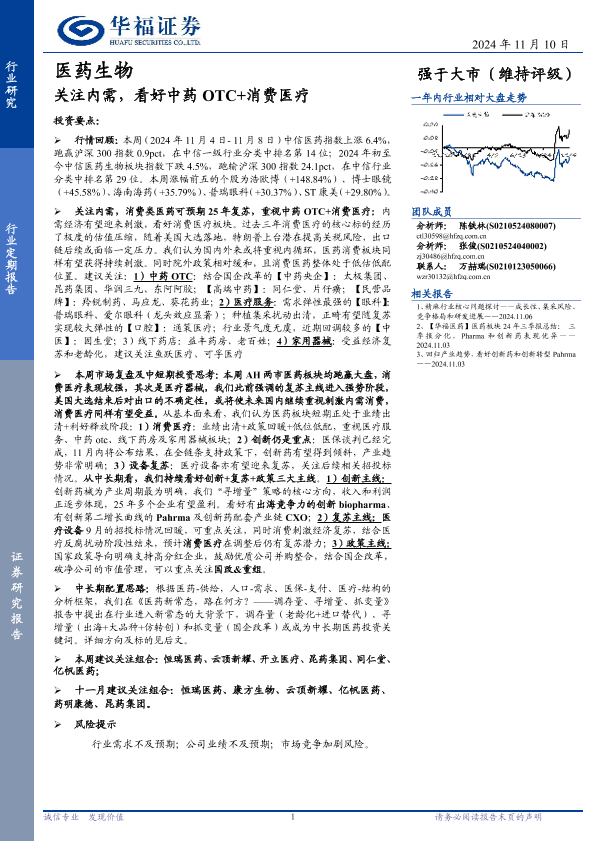 【华福证券】【20241110】医药生物行业定期报告:关注内需,看好中药OTC+消费医疗-20页
