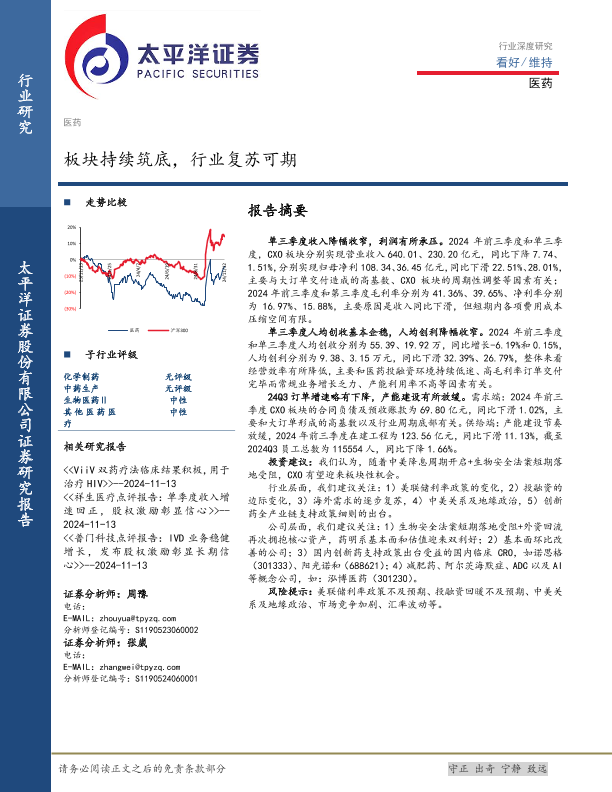 【太平洋证券】【20241113】医药行业深度研究:板块持续筑底,行业复苏可期-17页