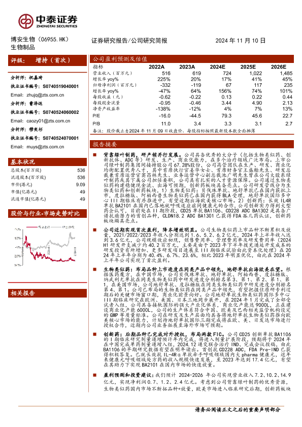 创新药 博安生物 生物类似药 盈利预测 证券分析