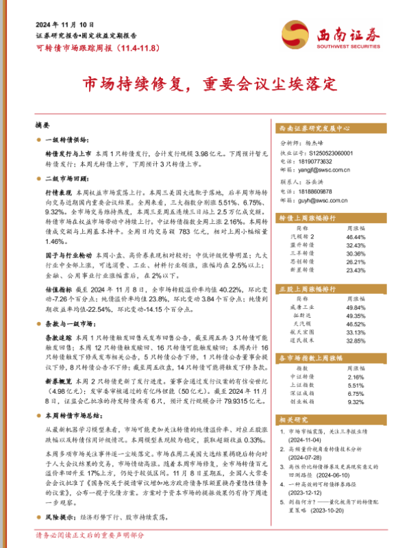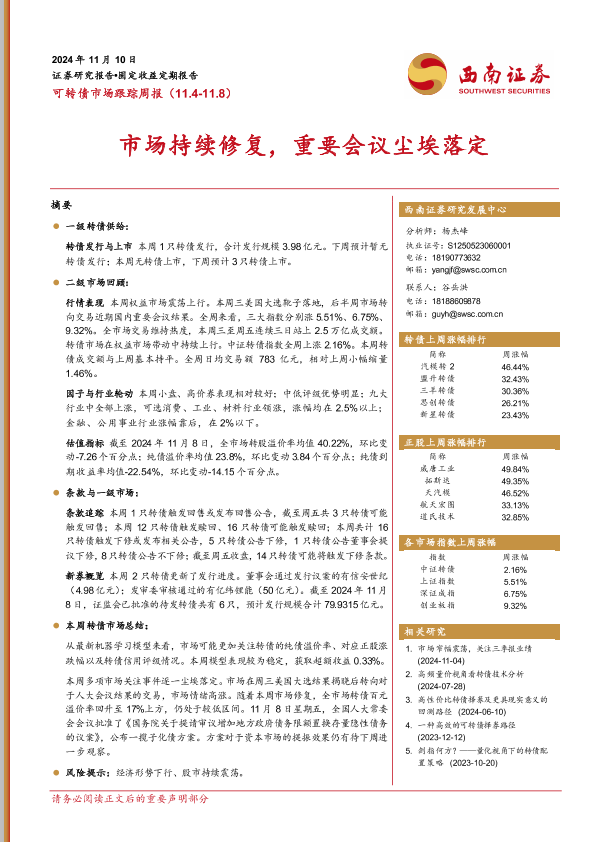 【西南证券】【20241110】可转债市场跟踪周报:市场持续修复,重要会议尘埃落定-14页