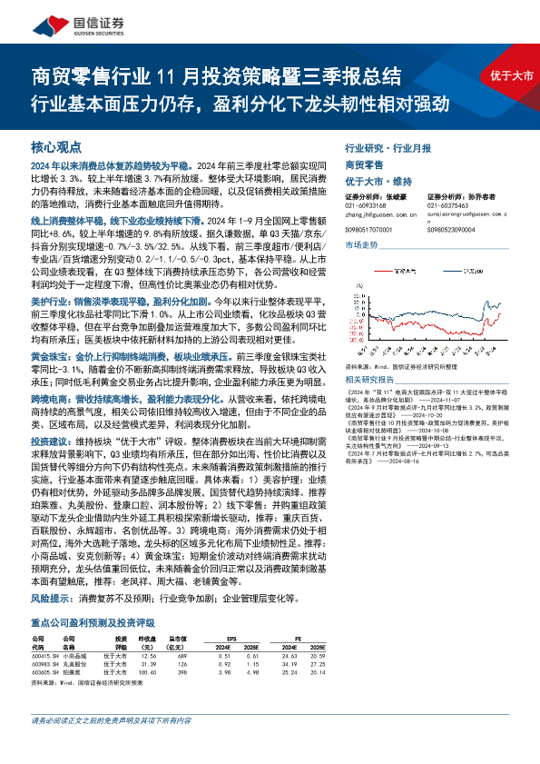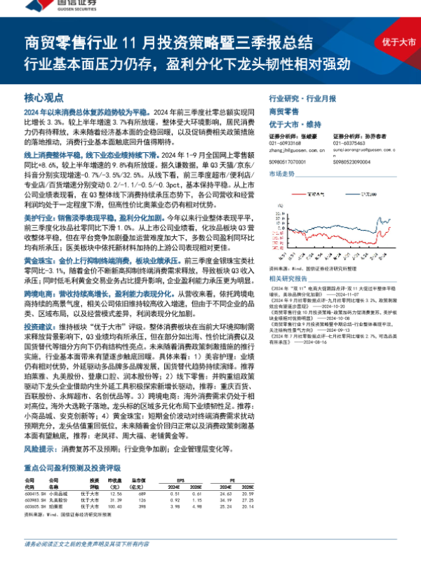 【国信证券】【20241112】商贸零售行业11月投资策略暨三季报总结:行业基本面压力仍存,盈利分化下龙头韧性相对强劲-12页