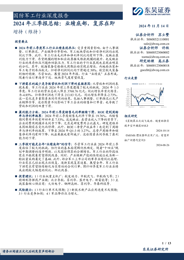 【东吴证券】【20241114】国防军工行业深度报告:2024年三季报总结,业绩底部,复苏在即-13页