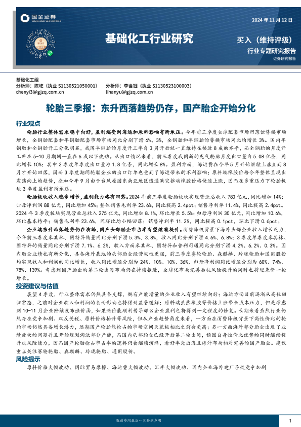 【国金证券】【20241112】基础化工行业轮胎三季报:东升西落趋势仍存,国产胎企开始分化-21页