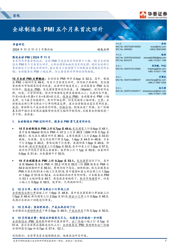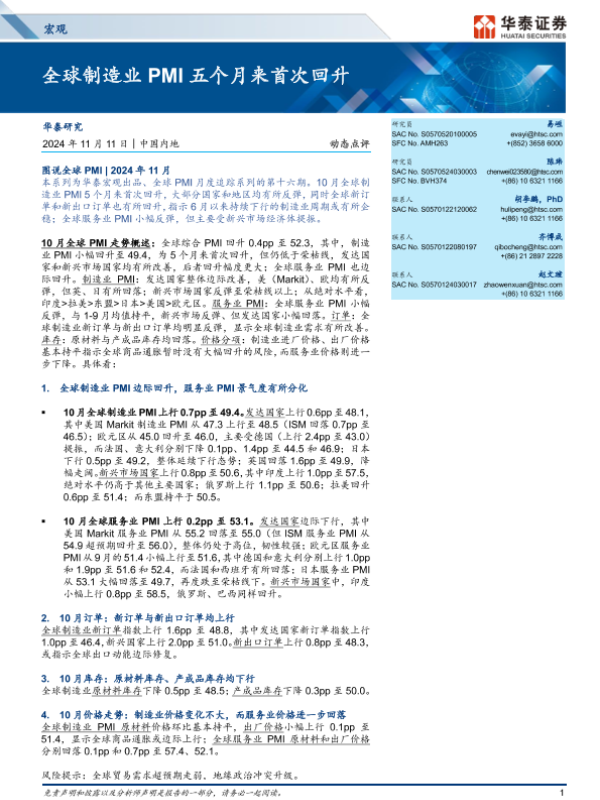 【华泰证券】【20241111】宏观动态点评:全球制造业PMI五个月来首次回升-19页