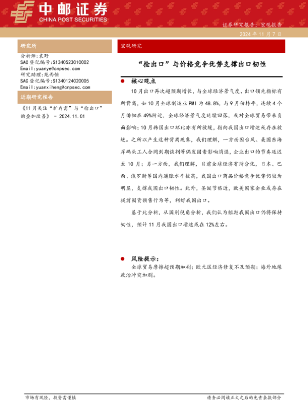 【中邮证券】【20241107】宏观研究:“抢出口”与价格竞争优势支撑出口韧性-13页