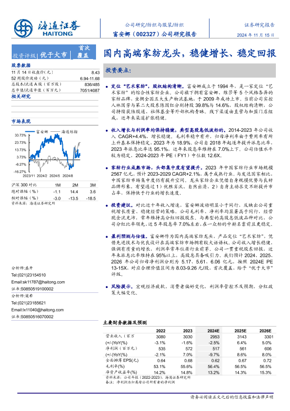 【海通证券】【20241115】富安娜(002327)国内高端家纺龙头,稳健增长、稳定回报-13页