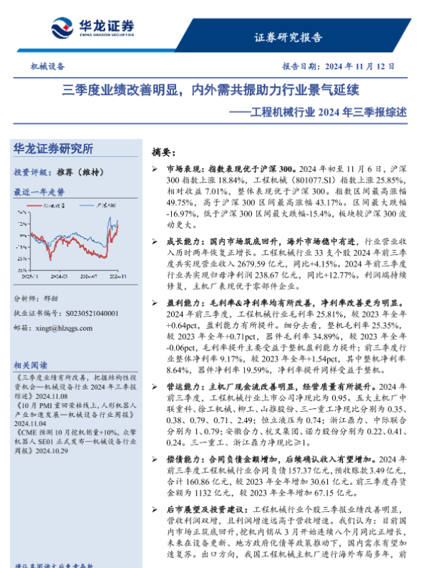 【华龙证券】【20241112】工程机械行业2024年三季报综述:三季度业绩改善明显,内外需共振助力行业景气延续-21页