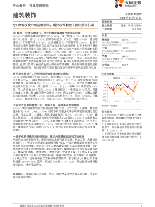 【天风证券】【20241114】建筑装饰行业专题研究:Q3建筑板块业绩持续承压,看好政策刺激下板块反转机遇-27页