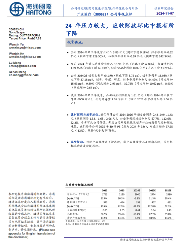 【海通国际】【20241107】开立医疗(300633)公司季报点评:24年压力较大,应收账款环比中报有所下降-12页