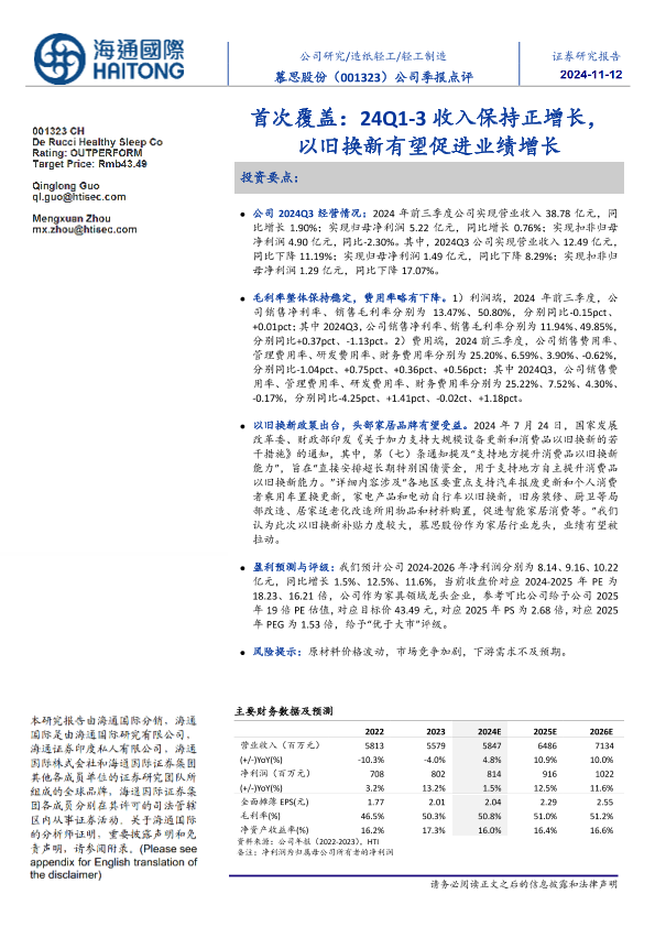 【海通国际】【20241112】慕思股份(001323)首次覆盖:24Q1_3收入保持正增长,以旧换新有望促进业绩增长-11页