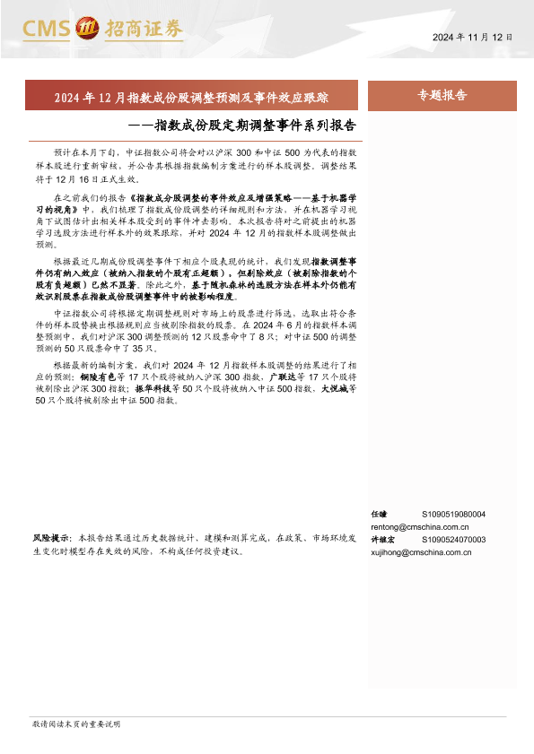 【海通证券】【20241112】指数成份股定期调整事件系列报告:2024年12月指数成份股调整预测及事件效应跟踪-10页
