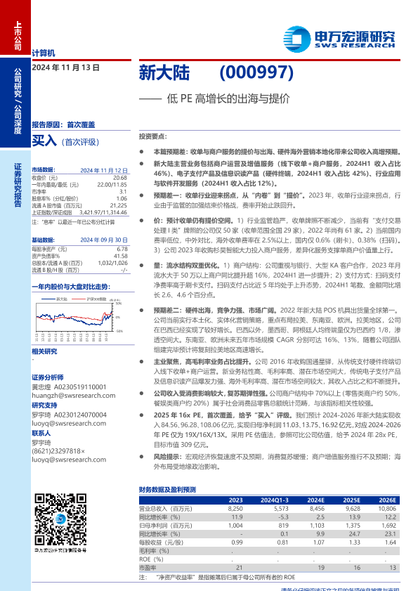 【申万宏源】【20241113】新大陆(000997)低PE高增长的出海与提价-31页