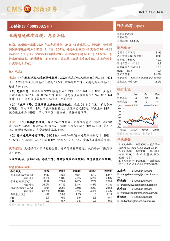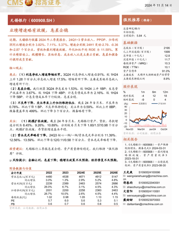 【海通证券】【20241114】无锡银行(600908)业绩增速略有放缓,息差企稳-16页