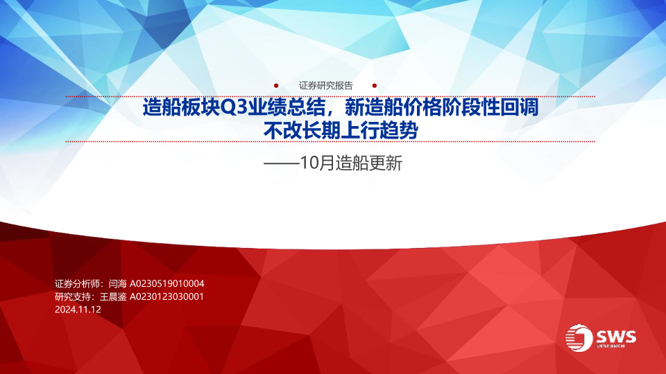 【申万宏源】【20241112】机械制造行业10月造船更新:造船板块Q3业绩总结,新造船价格阶段性回调不改长期上行趋势-46页