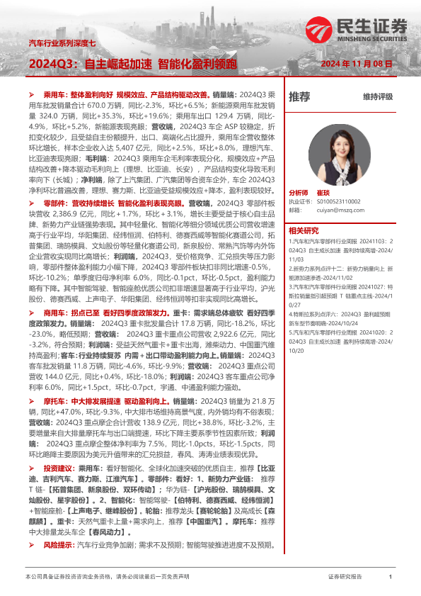 【民生证券】【20241108】汽车行业系列深度七,2024Q3:自主崛起加速,智能化盈利领跑-60页