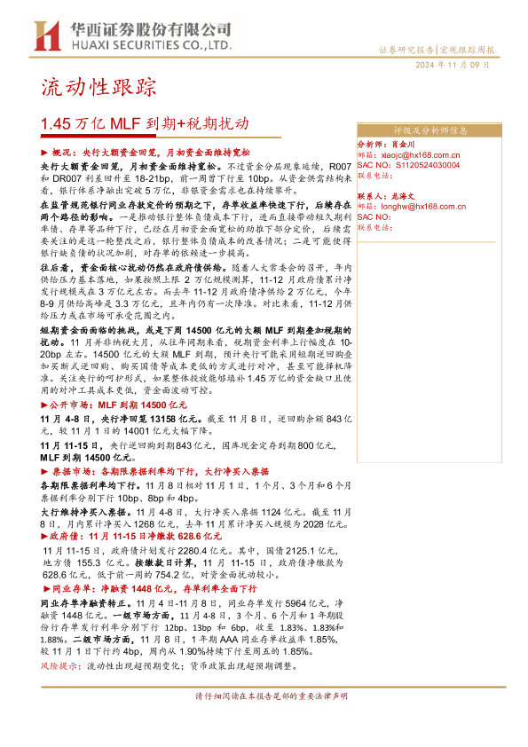 【华西证券】【20241109】流动性跟踪:1.45万亿MLF到期+税期扰动-20页