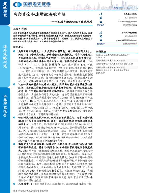 【国泰君安证券】【20241112】港股市场流动性与估值跟踪:南向资金加速增配港股市场-17页