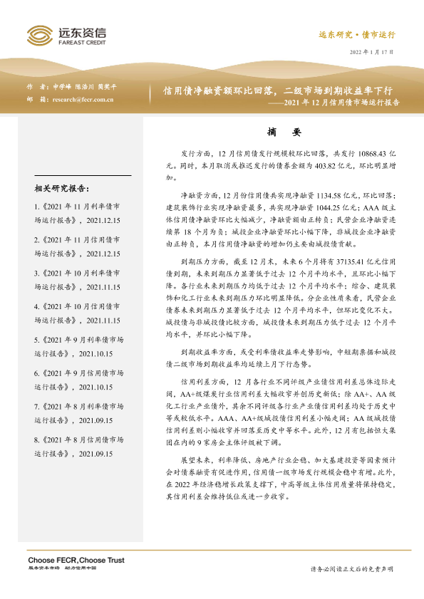 【远东资信】【20220117】2021年12月信用债市场运行报告:信用债净融资额环比回落,二级市场到期收益率下行-19页