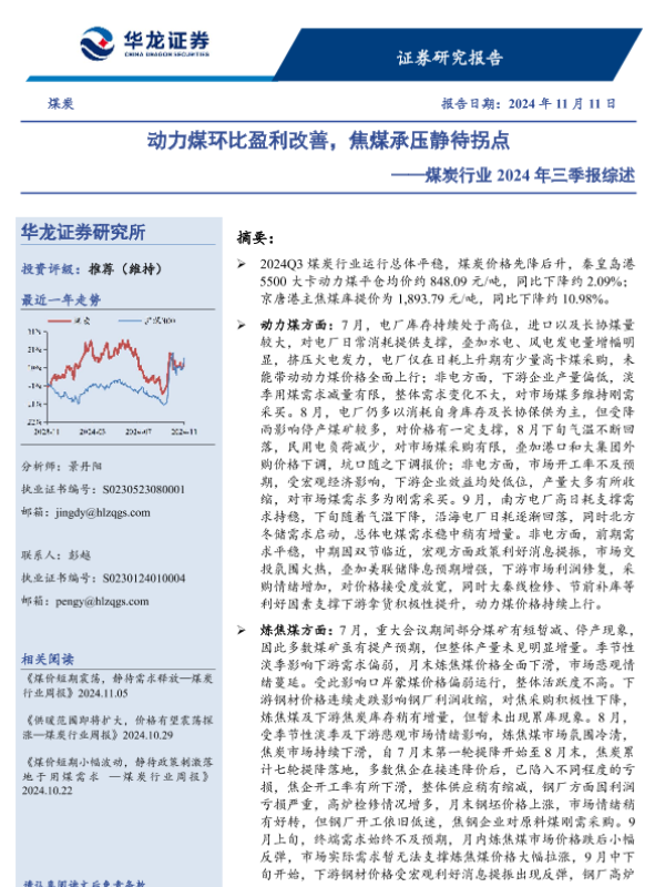 【华龙证券】【20241111】煤炭行业2024年三季报综述:动力煤环比盈利改善,焦煤承压静待拐点-19页