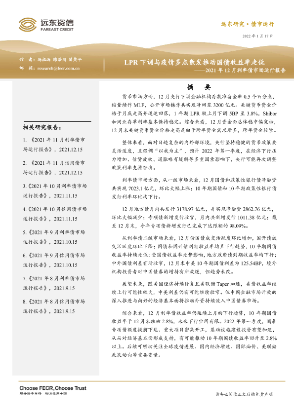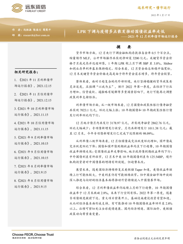 【远东资信】【20220117】2021年12月利率债市场运行报告:LPR下调与疫情多点散发推动国债收益率走低-19页